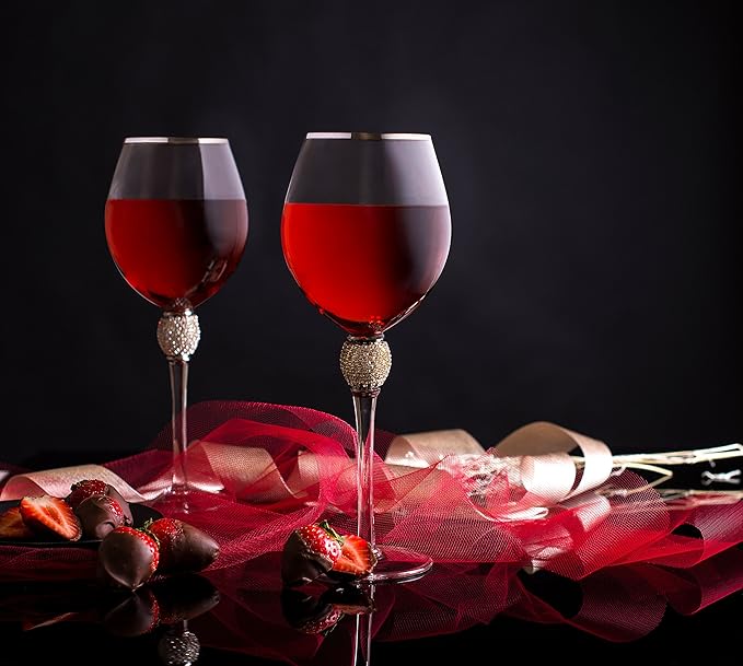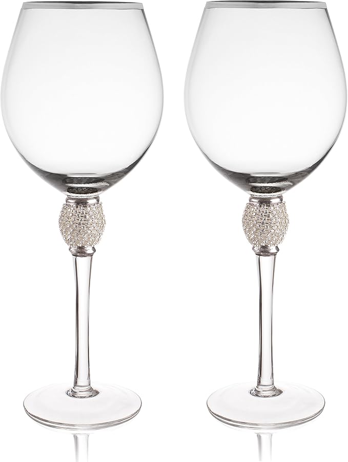 Trinkware Set of 2 Wine Glasses - Rhinestone "DIAMOND" Studded With Silver Rim - Long Stem, 16oz, 10-inches Tall - Elegant Glassware And Stemware