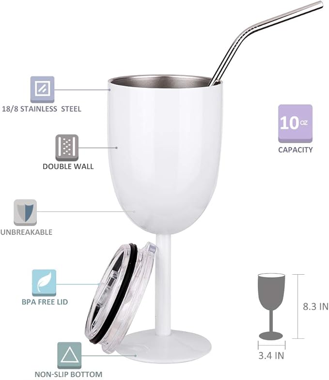 AMZUShome Stainless Steel Wine Glasses Cups.Double Walled Vacuum Insulated Wine Tumbler With Lid and Straw.Friendship,Christmas,Birthday Gifts for Women Men Friends Dad Mom(10oz White)