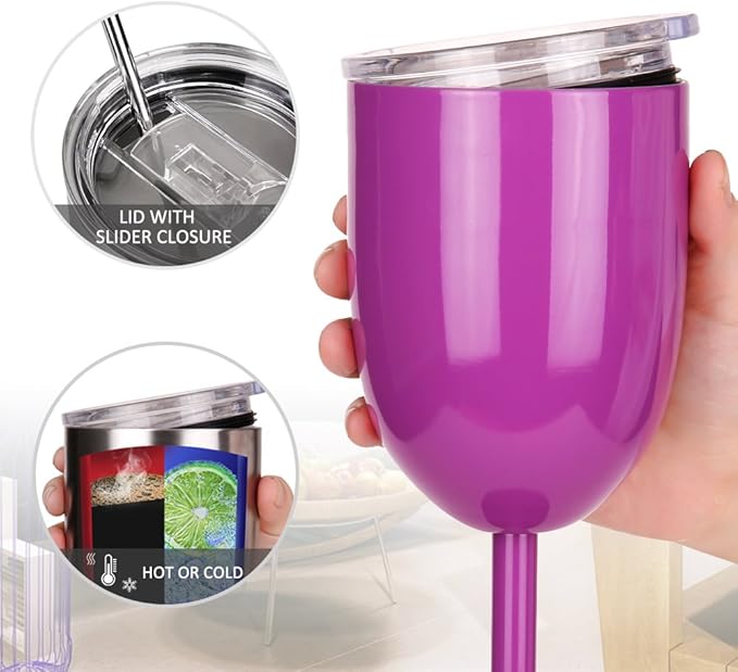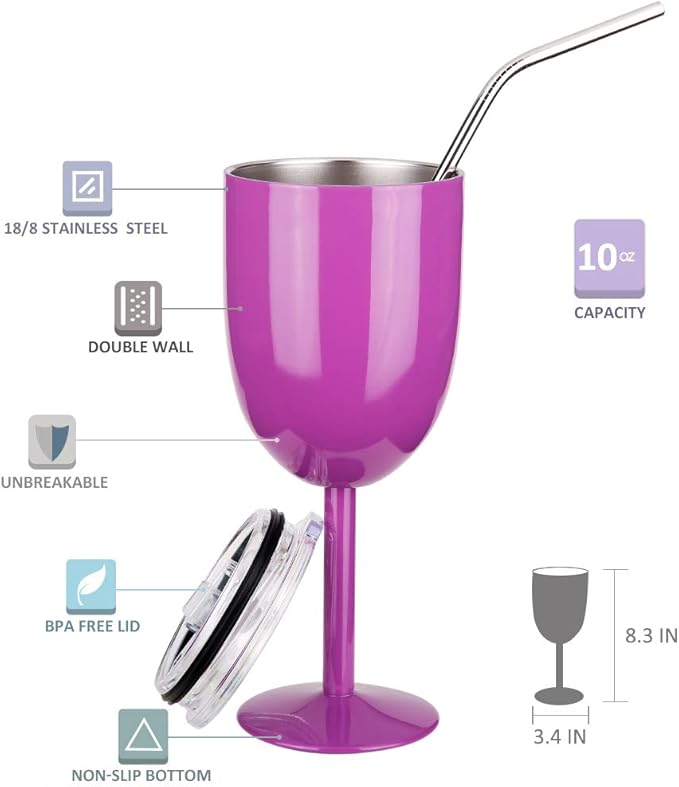 AMZUShome Stainless Steel Wine Glasses Cups.Double Walled Vacuum Insulated Wine Tumbler With Lid and Straw.Friendship,Christmas,Birthday Gifts for Women Men Friends Dad Mom(10oz Purple)