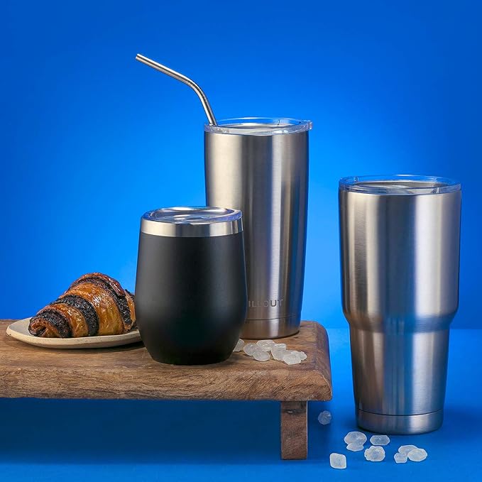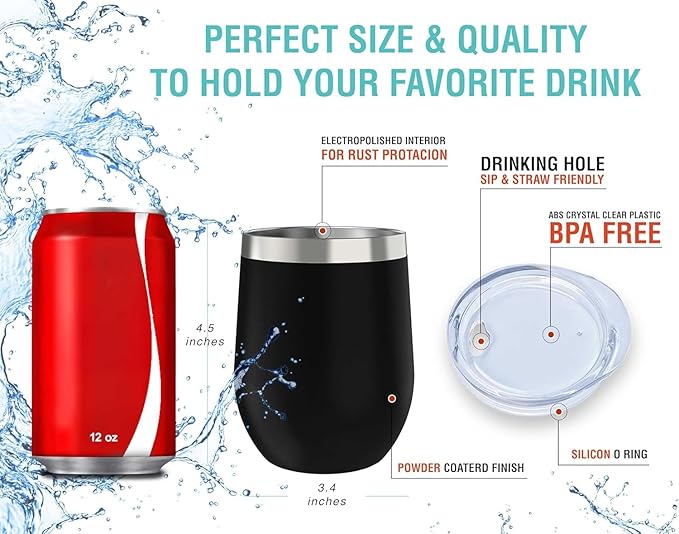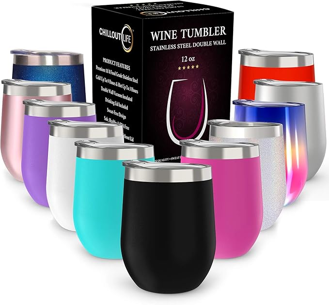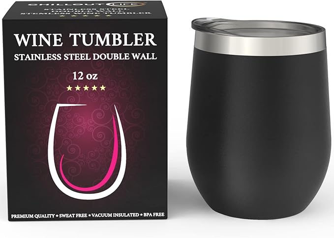 CHILLOUT LIFE 12 oz Stainless Steel Wine Tumbler with Lid - Double Wall Vacuum Insulated Wine Cup Glass Keeping Cold & Hot for Coffee, Champagne, Cocktails, Ice Cream - Powder Coated Black