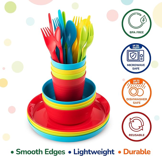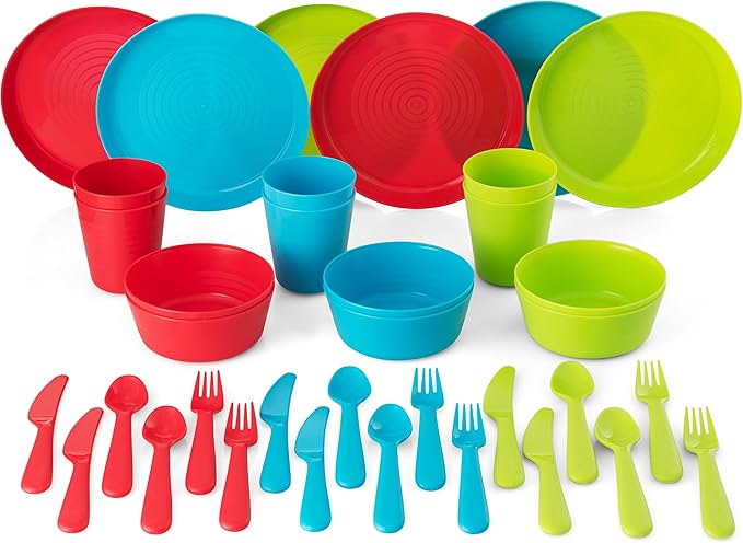 Kids Plastic Dinnerware Set - 36 Pc Reusable Children's Dinner Set Microwave / Dishwasher Safe BPA Free Toddler Dishes Dinnerware Set Includes Kids Plates and Bowls Kids Cups & Flatware.