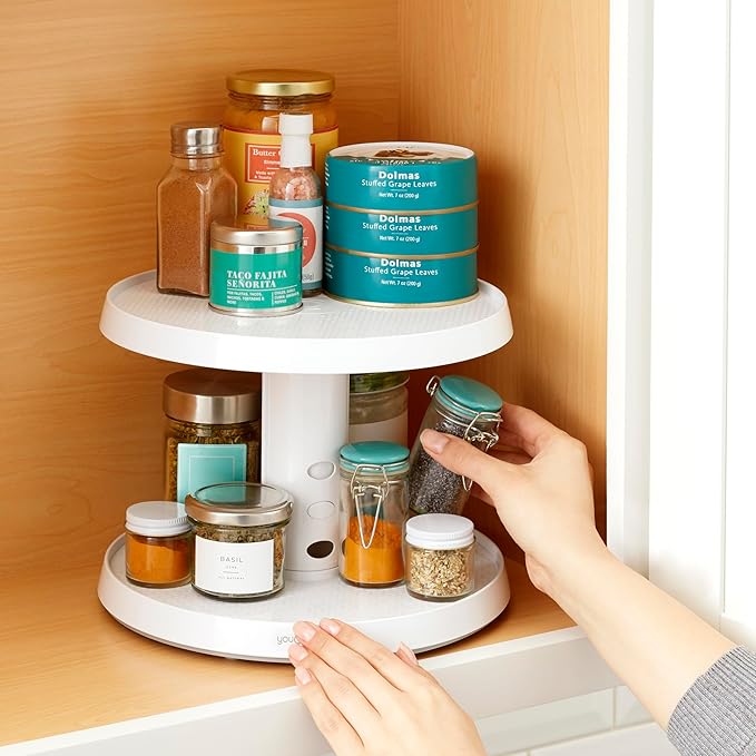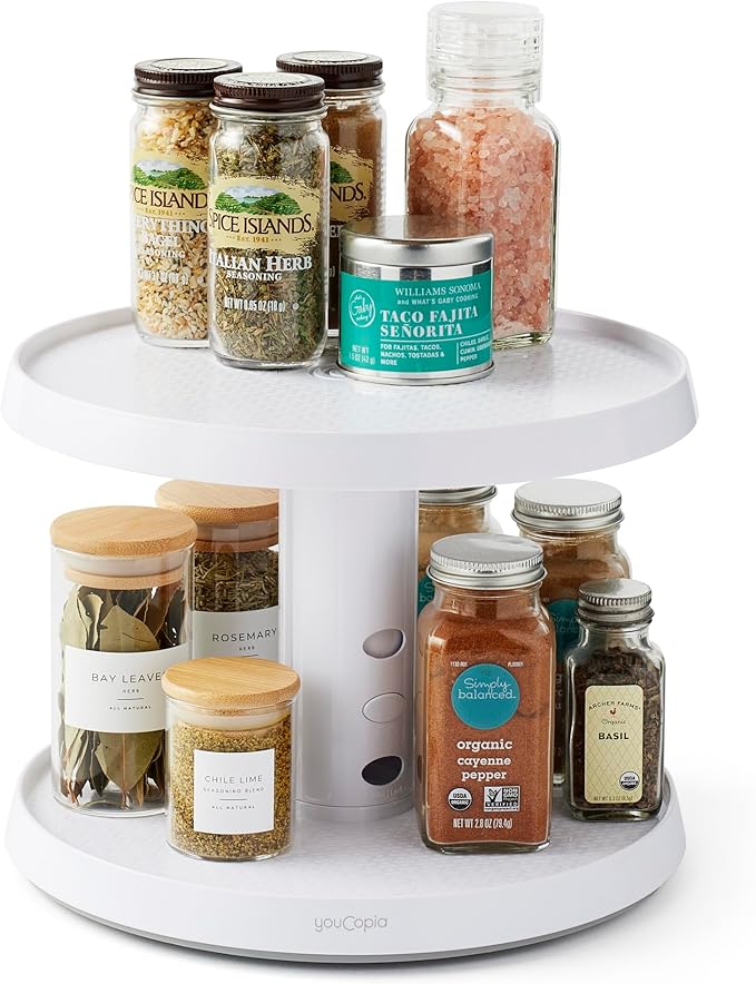 YouCopia Crazy Susan Two-Tier Turntable, Height-Adjustable Lazy Susan Organizer for Kitchen Cabinet and Pantry Organization and Storage, White