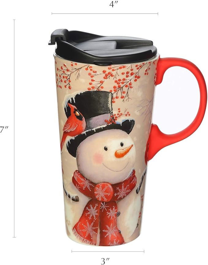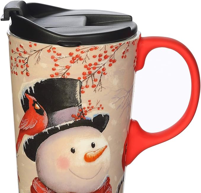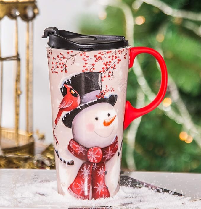 Topadorn Christmas Ceramic Travel Mug Porcelain Coffee Cup with Spill-proof Lid and Gift Box for Holiday,Snowman&Cardinal