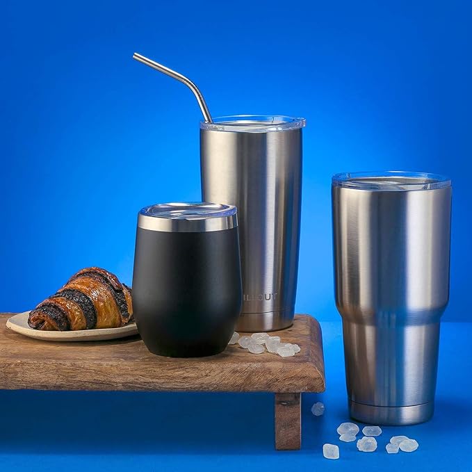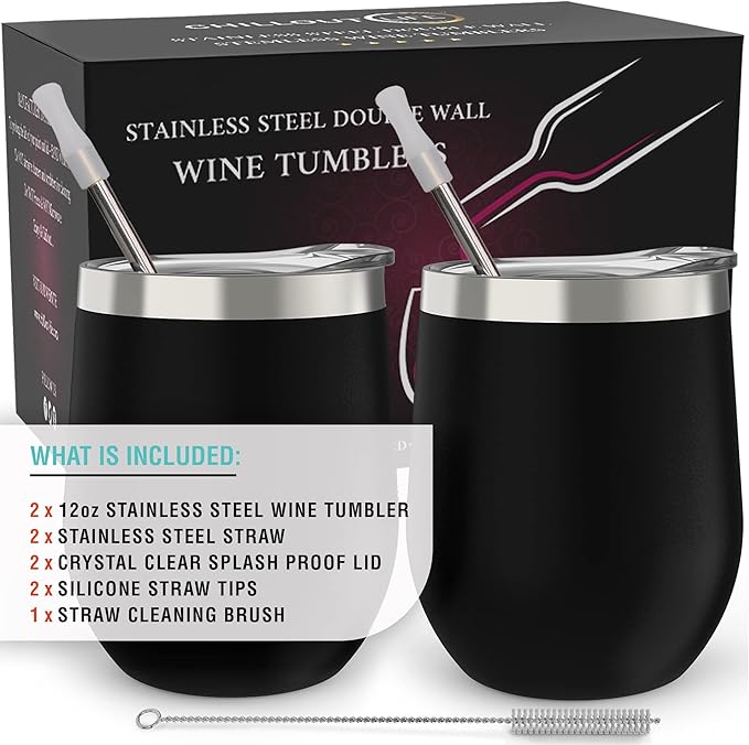 CHILLOUT LIFE 12 oz Stainless Steel Wine Tumblers 2 Pack - Double Wall Vacuum Insulated Wine Glasses Cups with Lids and Straws Set Keeping Cold & Hot for Coffee, Beer, Ice Cream - Powder Coated Black