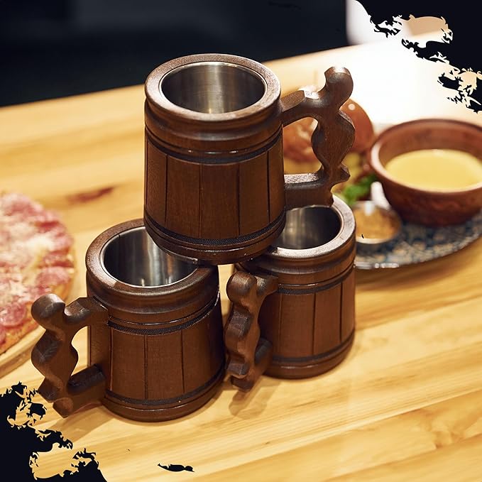 Set of 6 Beer Mug 10 OZ - Coffee Mug - Beer stein - Wooden beer mug - Stainless Steel Cup - Handmade Gifts for Men - Fathers Day, Christmas or Birthday Gift Idea - Men Mug - Classic Brown