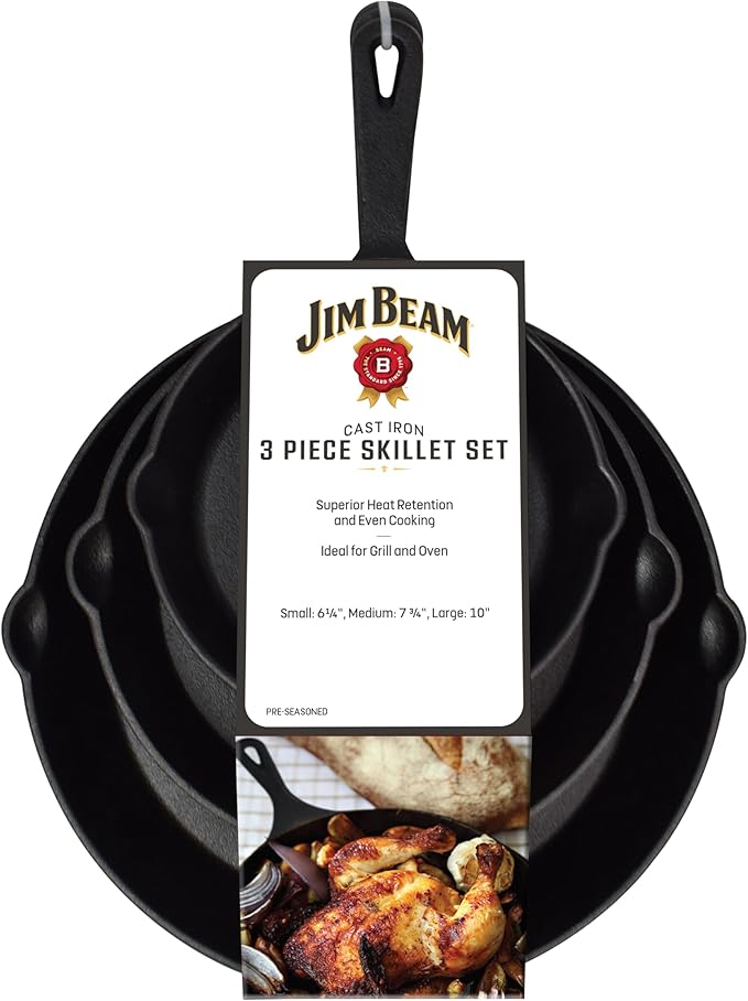 About This 3 piece set: the Jim Beam 3 piece cast iron set has 3 skillets which are pre seasoned... Read more