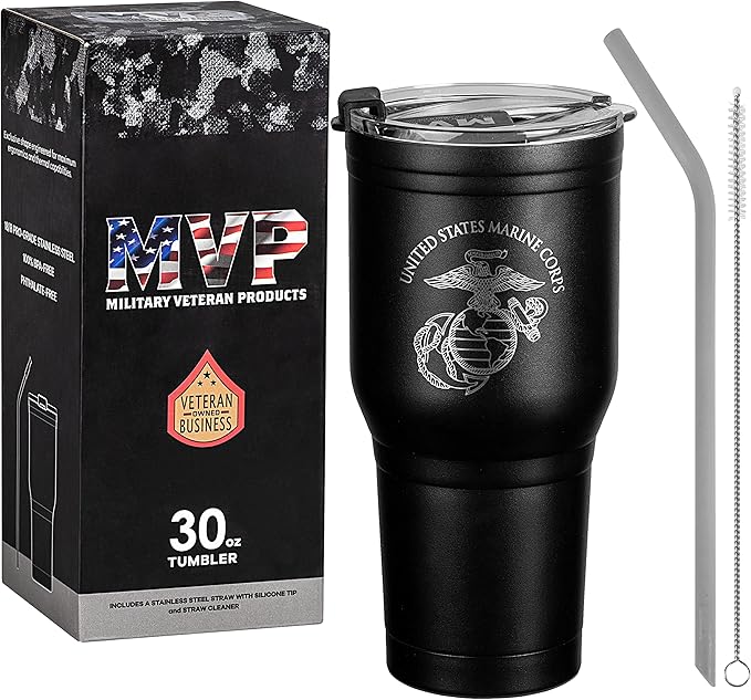 Military Gift Shop USMC 30 oz Coffee Travel Mug | Double Wall Vacuum Insulated Coffee Tumbler | Stainless Steel Coffee Mug With Lid & Straw USMC 30oz Tumbler