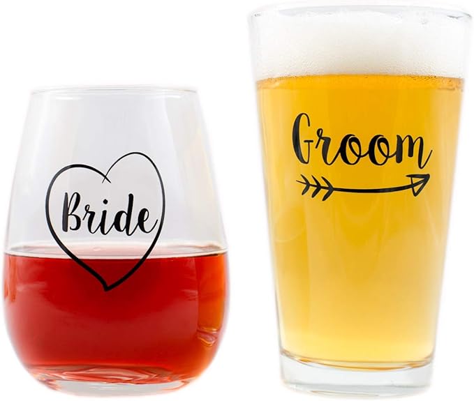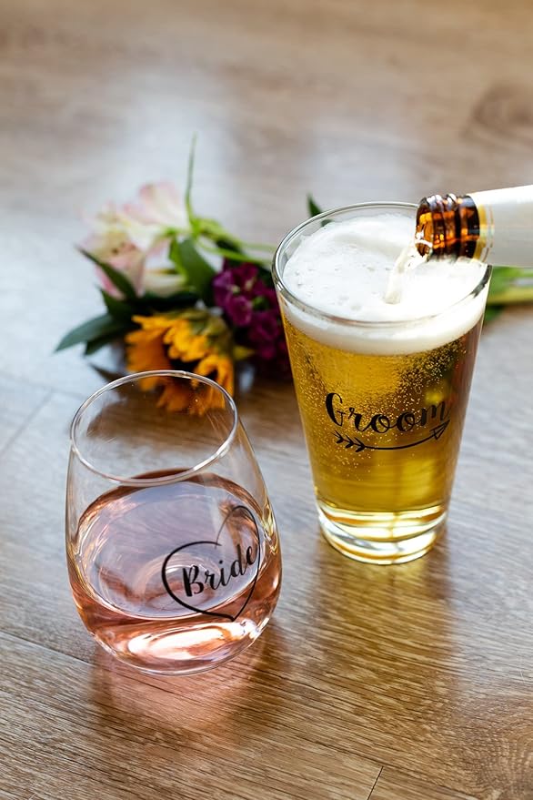Cute Wedding Gifts - Bride and Groom Novelty Wine Glass and Beer Glass Combo - Engagement Gift for Couples