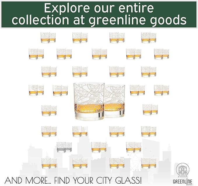 Greenline Goods Whiskey Glasses - 10 Oz Tumbler Gift Set for Boston lovers, Etched with Boston Map | Old Fashioned Rocks Glass - Set of 2