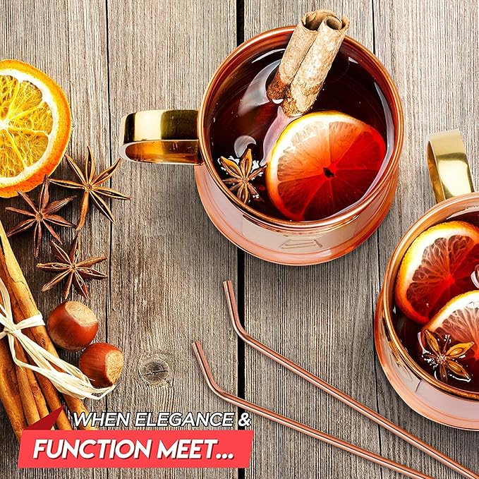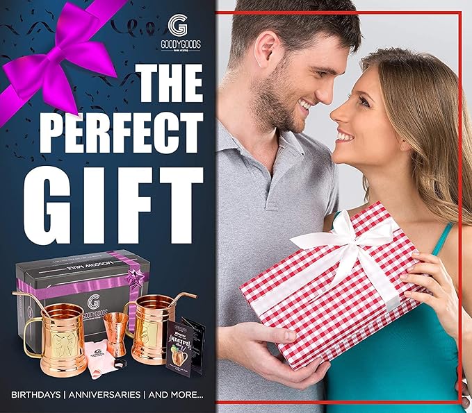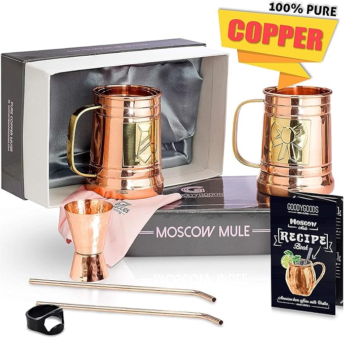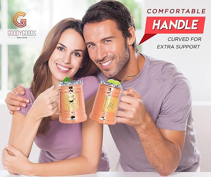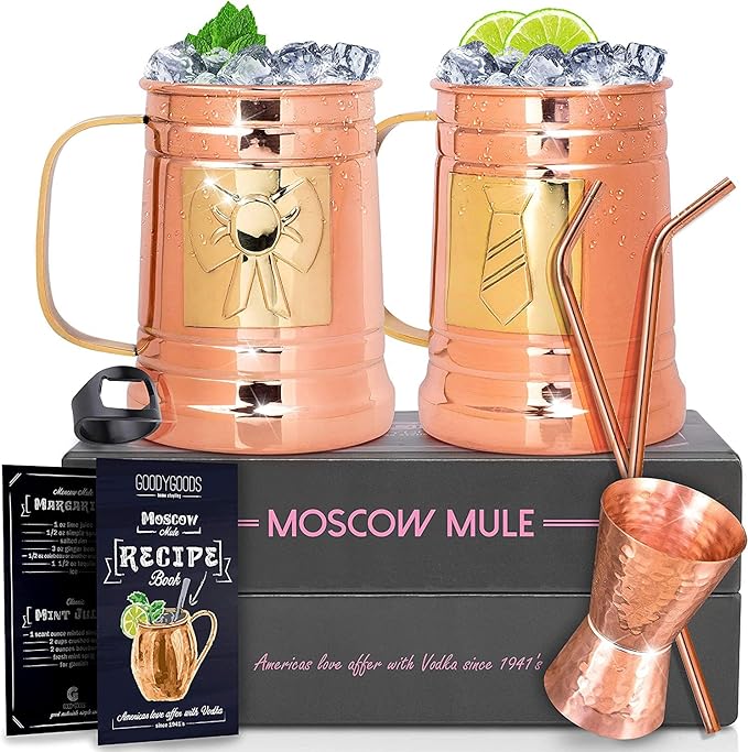 G GOODYGOODS Moscow Mule Copper Mugs: Make Any Drink Taste Better! 100% Pure Solid Copper His & Hers Gift Set - 2 Hammered 18 OZ Cups, 2 Unique Straws, Jigger & Recipe Booklet
