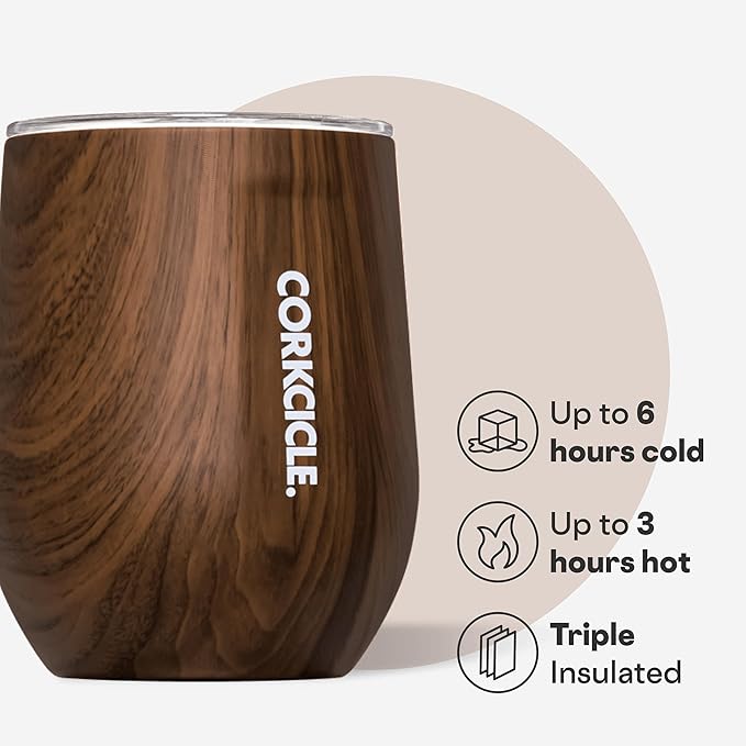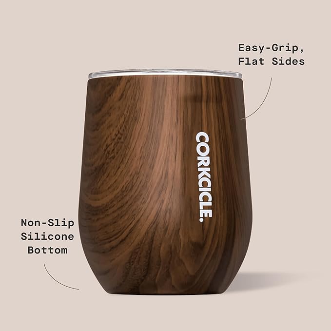 Corkcicle Stemless Insulated Wine Glass Tumbler - Keeps Beverages Cold 6 Hrs Hot 3 Hrs - Stainless Steel - Easy-Grip - Summer Drinkware Gift - Keeps Drinks Ice Cold - 12 oz - Walnut Wood