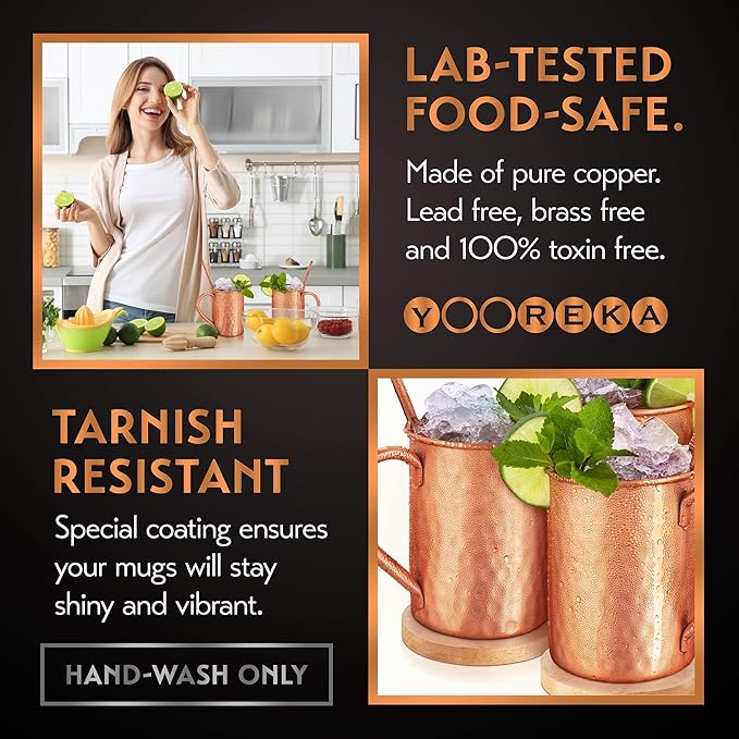 Gift Set Moscow Mule Mugs Set Of 4 16 oz Solid Cooper, 100% Pure Copper Cups Cylindrical Shape HANDCRAFTED, BONUS 4 Straws, 4 Wood Coasters, Stirring Spoon, And Shot Glass (Square)