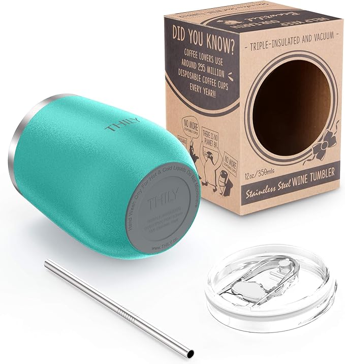 THILY Stainless Steel Stemless Wine Glass T1 Triple Vacuum Insulated Travel Wine Tumbler Cup with Lid and Reusable Straw, 12 oz, Keep Drinks Cold or Hot, Teal