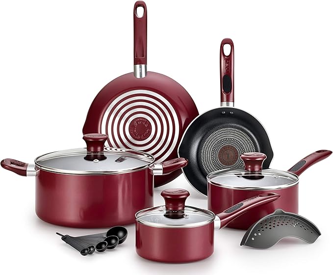 T-fal B039SE64 B039SE Excite ProGlide Nonstick Thermo-Spot Heat Indicator Dishwasher Oven Safe Cookware Set, 14-Piece, Red, 2.3 Rio