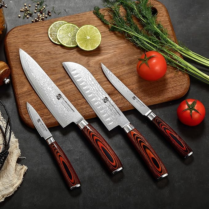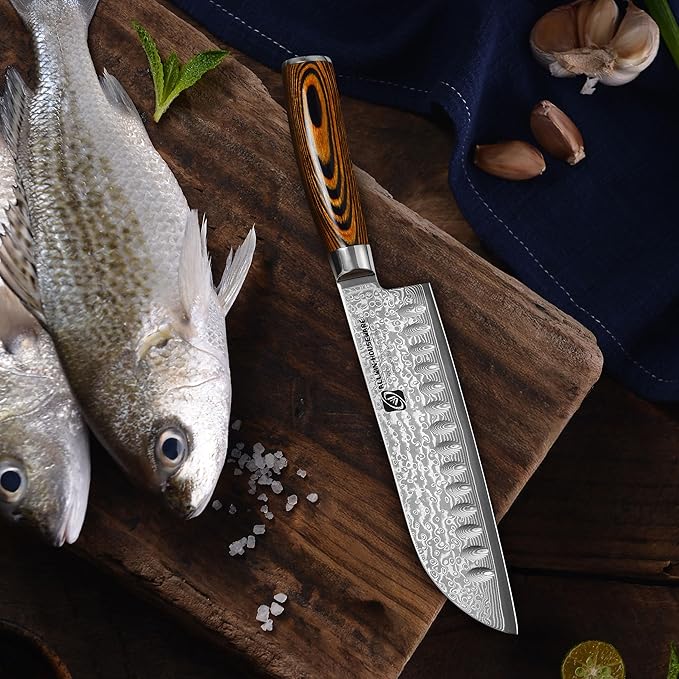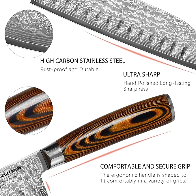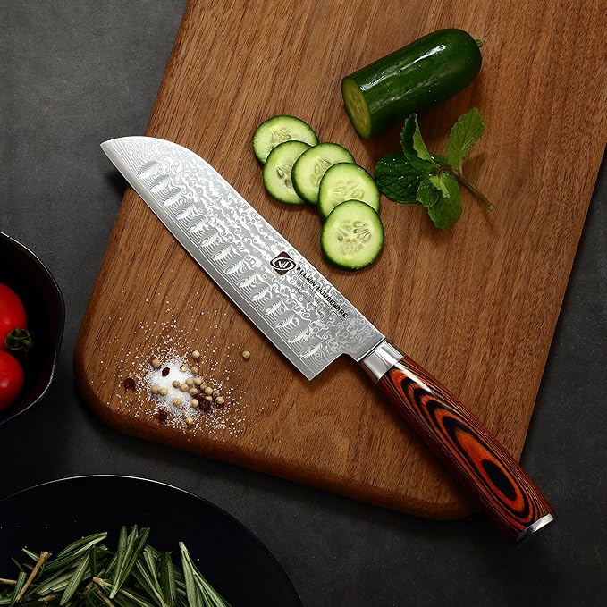About This 【JAPANESE SANTOKU DESIGN】This 7-inch Damascus Santoku knife embodies the Japanese design known for versatility. Its flat edge and... Read more