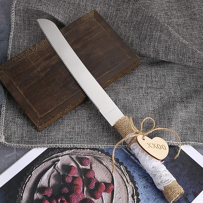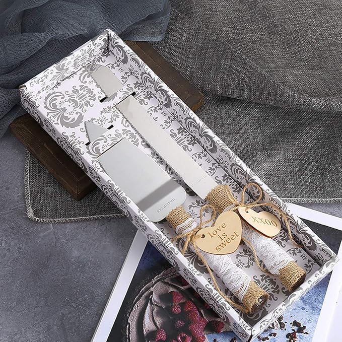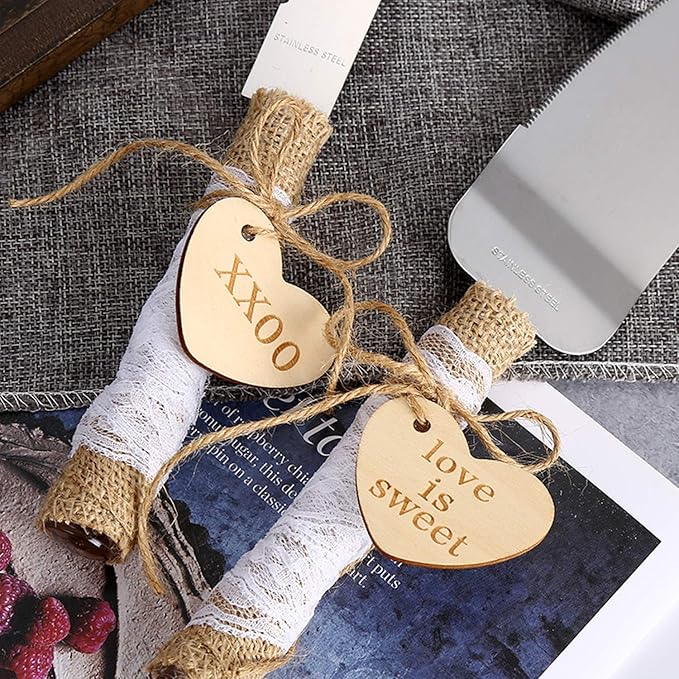 TANG SONG Rustic Style Stainless Steel Wedding Cake Knife and Serving Set Resin Plastic Handle with Twine Heart Love Wood Tag and Burlap Lace Design