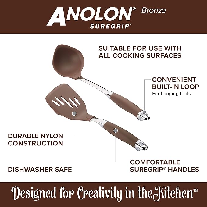 About This SUREGRIP HANDLES: Sturdy stainless steel tongs have Anolon SureGrip handles for a soft yet confident grip BPA FREE:... Read more