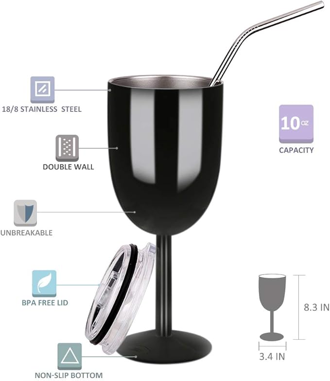 AMZUShome Stainless Steel Wine Glasses Cups.Double Walled Vacuum Insulated Wine Tumbler With Lid and Straw.Friendship,Christmas,Birthday Gifts for Women Men Friends Dad Mom(10oz Black)