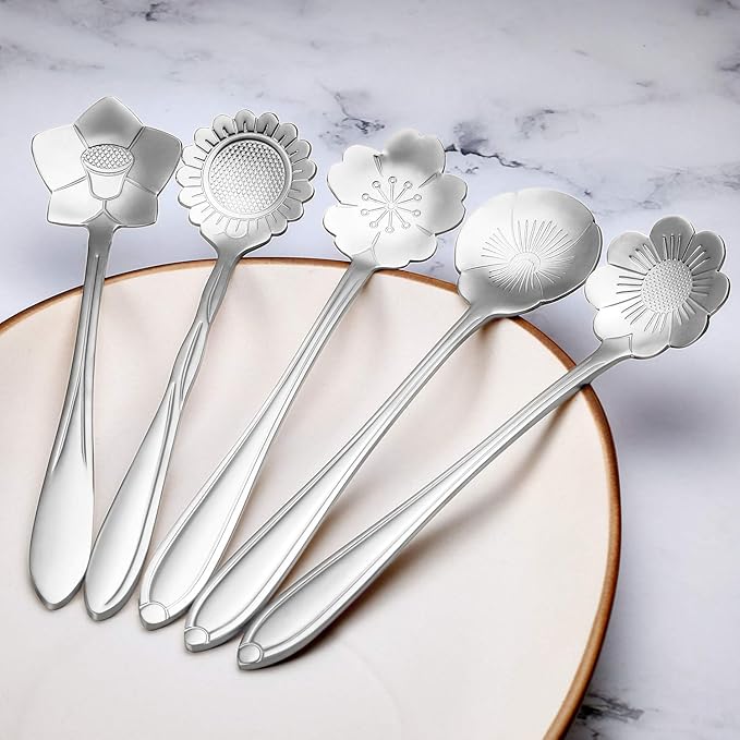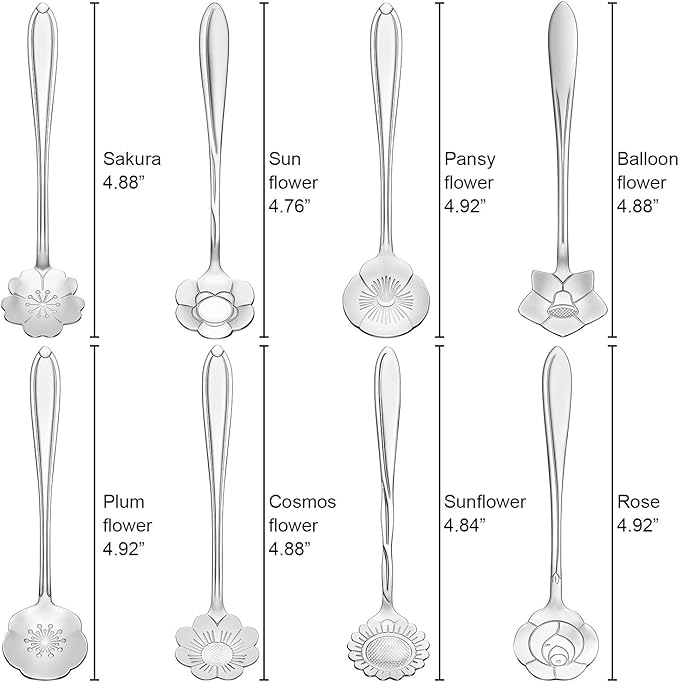 Chengu 8 Pieces Flower Coffee Tea Spoons Stainless Steel Sugar Spoons Tea Party Flower Fancy Tableware Set Stir Bar Creative Stirring Teaspoon, 8 Different Patterns(Silver)