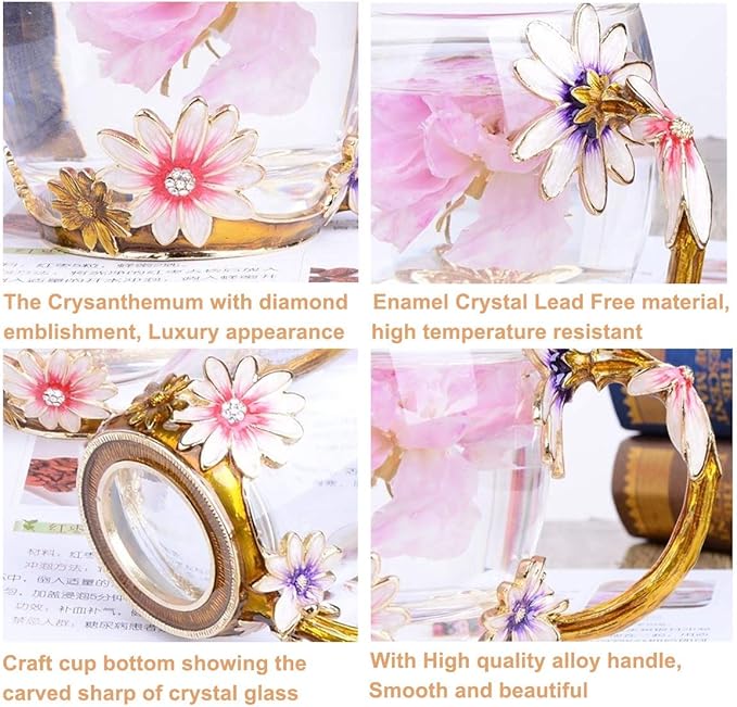 Handicraft Crystal Glass 3D Flower Cups Tea Mug With Tea Spoon Women Coffee, Tea, Juice, Beer, Milk Hot And Cold Drinks Use Gift Package. (Chrysanthemum, 12 OZ)