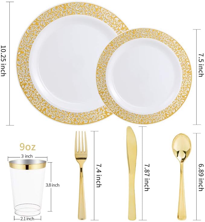 WELLIFE 175 PCS Gold Plastic Plates, Gold Rim Plastic Dinnerware Set, Includes: 25 Dinner plates, 25 Salad Plates, 25 Tumblers 9oz, 50 Forks, 25 Knives and 25 Spoons for Party