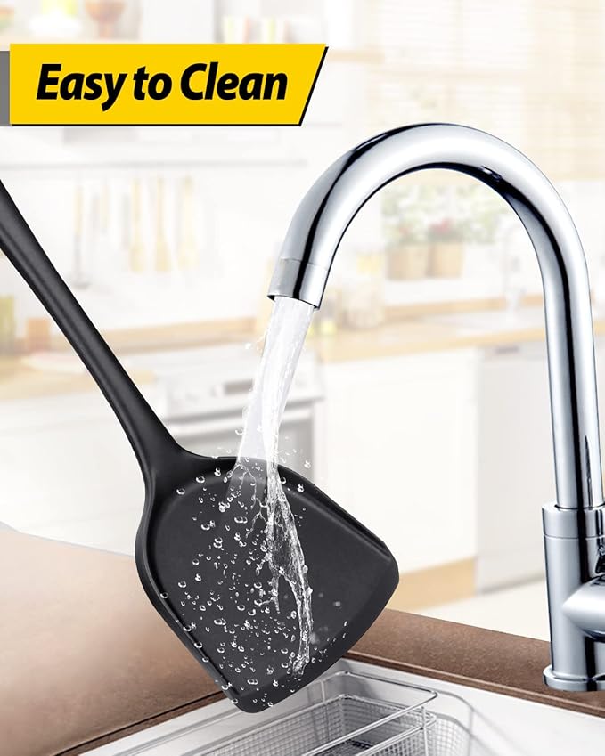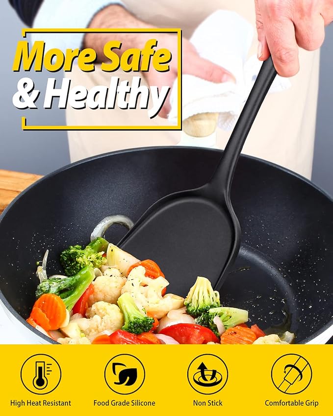 Pack of 2 Silicone Wok Spatula, Non-Stick, Heat Resistant, Easy to Clean and Dishwasher Safe, Seamless Kitchen Utensil for Cooking, Baking, Stir-Fry (Black)