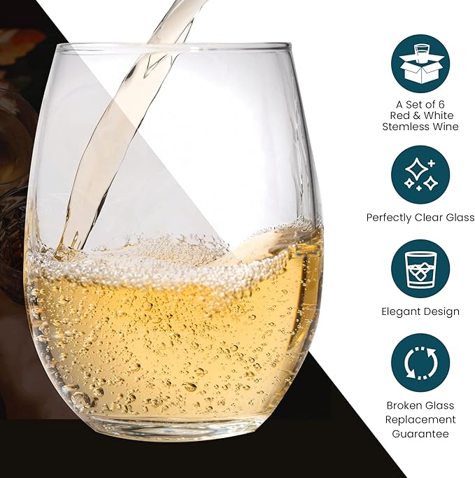Stemless Wine Glass, Red & White 18oz Stemless Wine Glass Set of 6, Drink Glasses with Durable Chip Resistant Rim, Large Wine Glasses for Enhanced Aeration, Wine Accessories for Parties (18oz -6Pack)