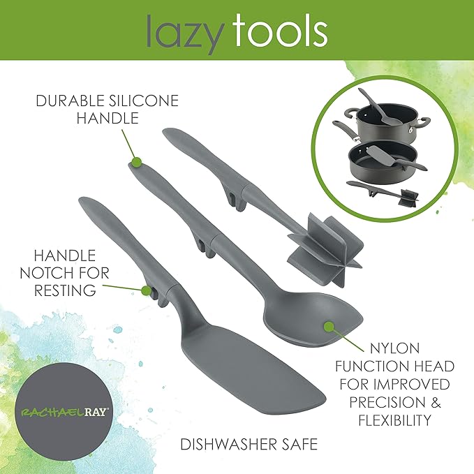 Rachael Ray Tools and Gadgets Lazy Crush & Chop, Flexi Turner, and Scraping Spoon Set / Cooking Utensils - 3 Piece, Gray