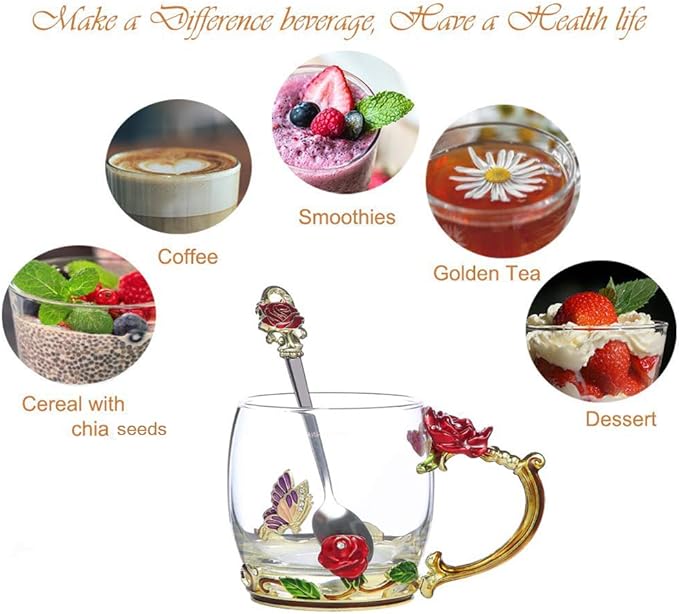Handicraft Crystal Glass 3D Flower Cups Tea Mug With Tea Spoon Women Coffee, Tea, Juice, Beer, Milk Hot And Cold Drinks Use Gift Package. (Rose Red Coffee Cup, 11 OZ)