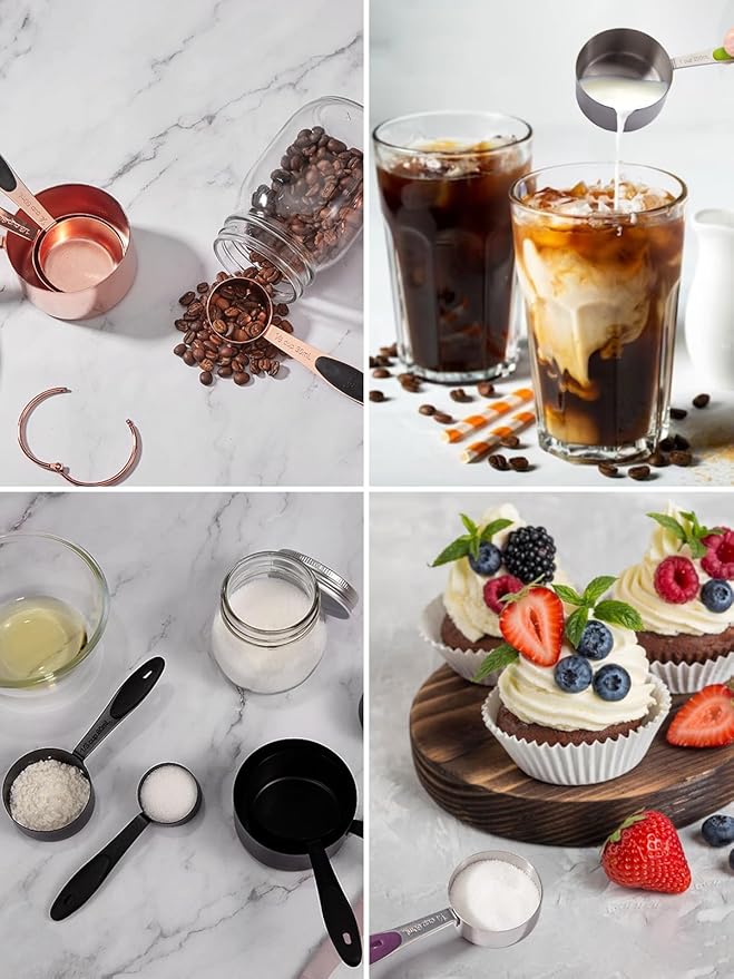 Joyhill Copper Measuring Cups and Spoons Set of 10 Piece, Stainless Steel Nesting Measuring Cup Set with Soft Touch Silicone Handles for Dry and Liquid Ingredients