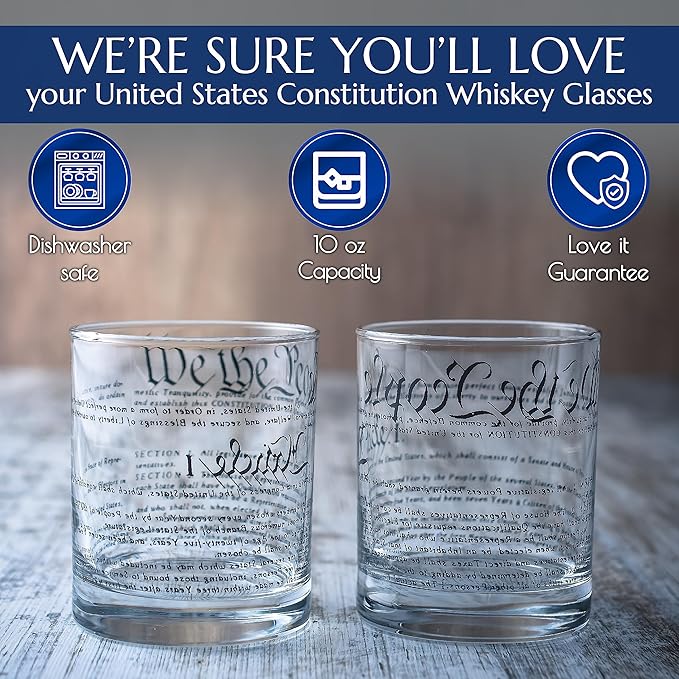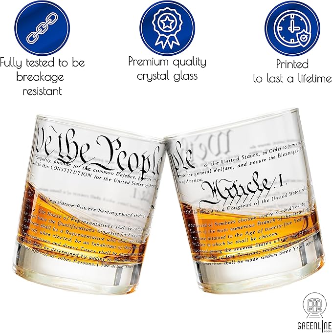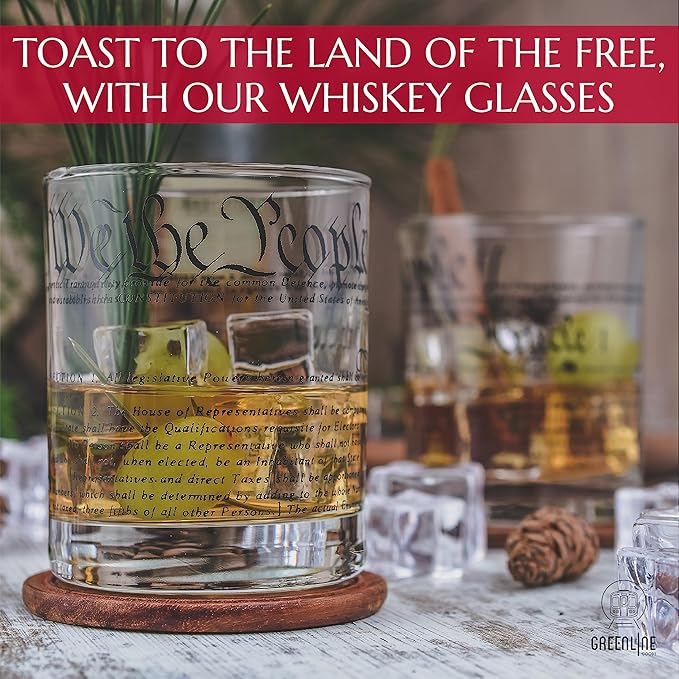 About This Patriotism personified - Each premium whiskey glass reflects the unmistakable United States Constitution. This celebrated historical document wraps... Read more