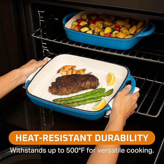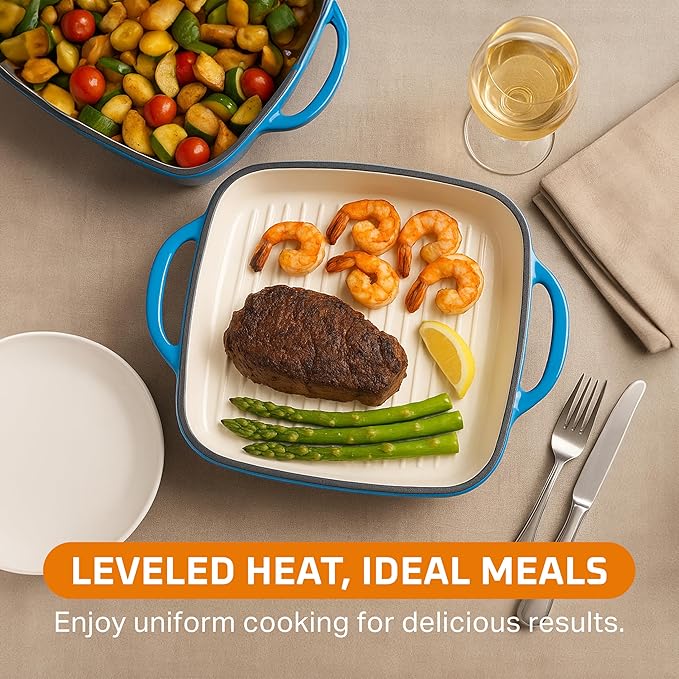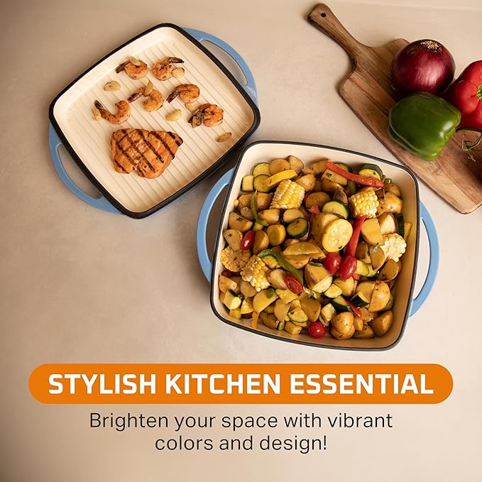 Bruntmor 2-in-1 Square Dutch Oven Casserole Dish with Lid, Dual Handles and Grill Pan for Baking, Braising and Grilling - Durable All-in-One Enameled Cast Iron Cookware Set for Kitchen, Whale Blue