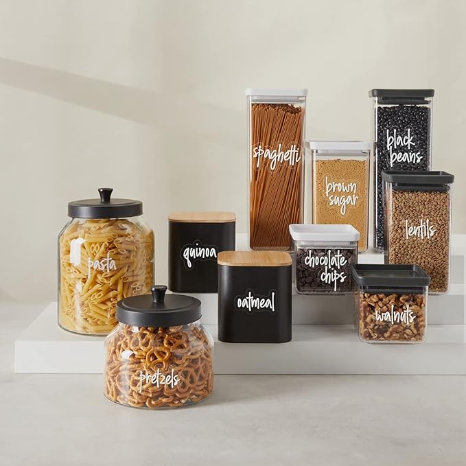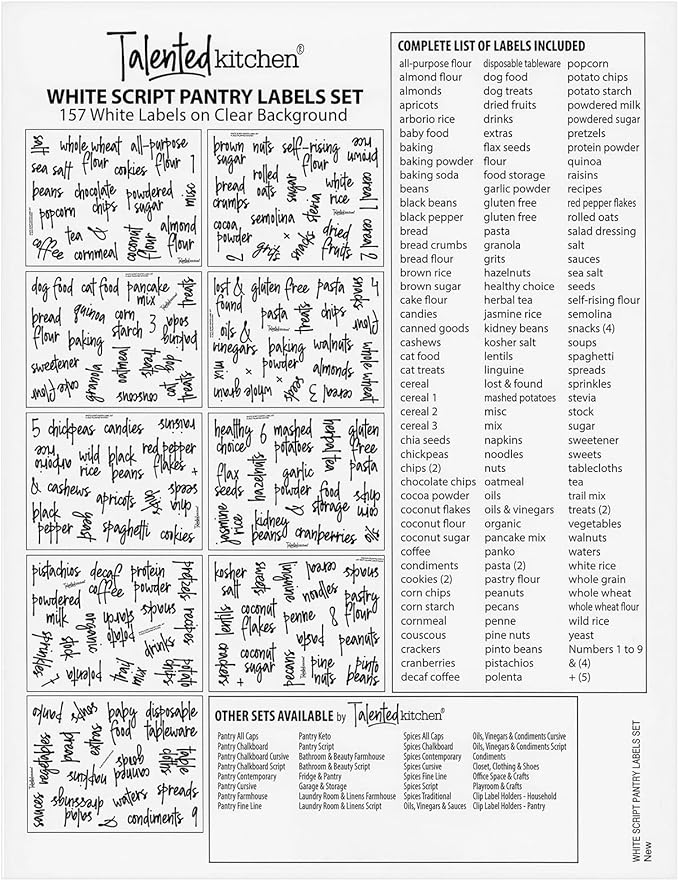 About This Streamlined Pantry Organization: Experience effortless kitchen organization with Talented Kitchen's 157 preprinted pantry labels, featuring elegant white script.... Read more