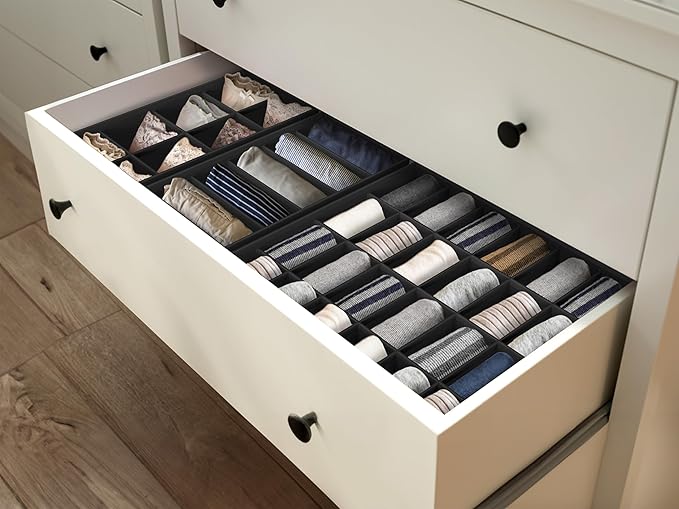 About This 4 Versatile Organizers - Includes 6 cell(scarves, ties), 8 cell(underwear, briefs, ties), 7 cell(bra), 24 cell(socks) bins to... Read more