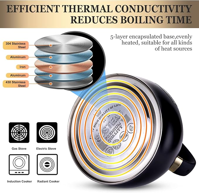 SUSTEAS Stove Top Whistling Tea Kettle - Food Grade Stainless Steel Teakettle Teapot with Cool Touch Ergonomic Handle, With 1 Silicone Pinch Mitt Included, 2.64 Quart(BLACK)