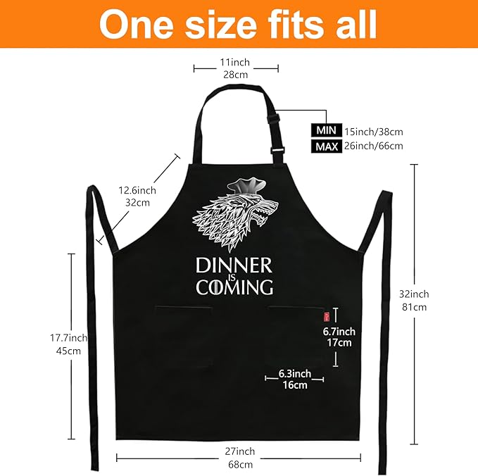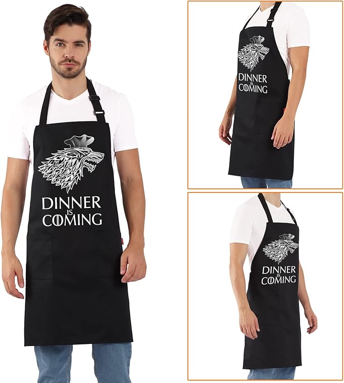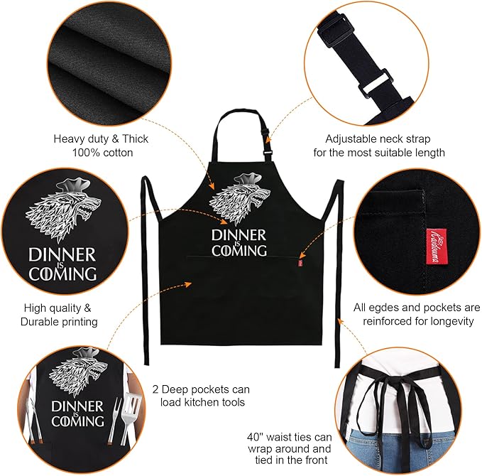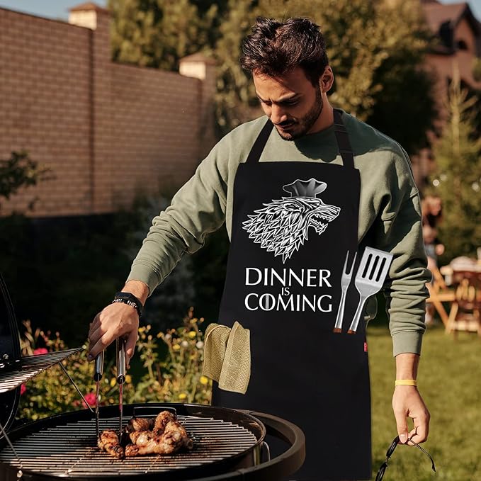 Grill Aprons for Men Women, Dinner is Coming Kitchen Chef Apron with 2 Pockets and 40" Long Ties, Adjustable Bib Apron for Cooking, BBQ, Baking, Gardening, Black