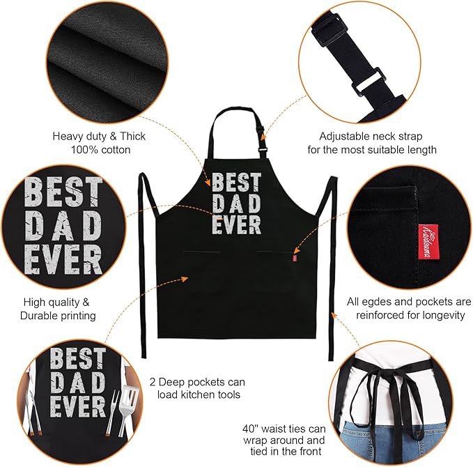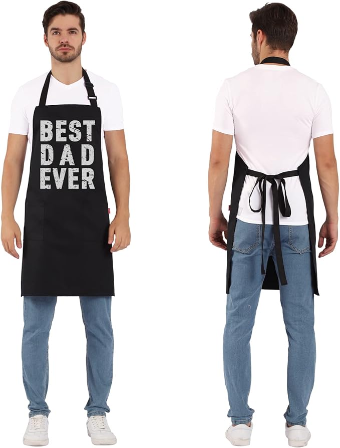 BBQ Funny Apron for Men - Best Dad Ever - Chef Bib Apron with 2 Pockets, Adjustable Neck Strap and 40" Long Ties - Best for Kitchen Cooking, Grilling, Baking, Gardening - Black