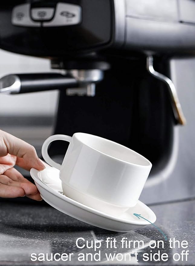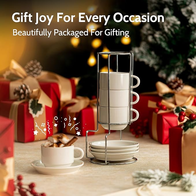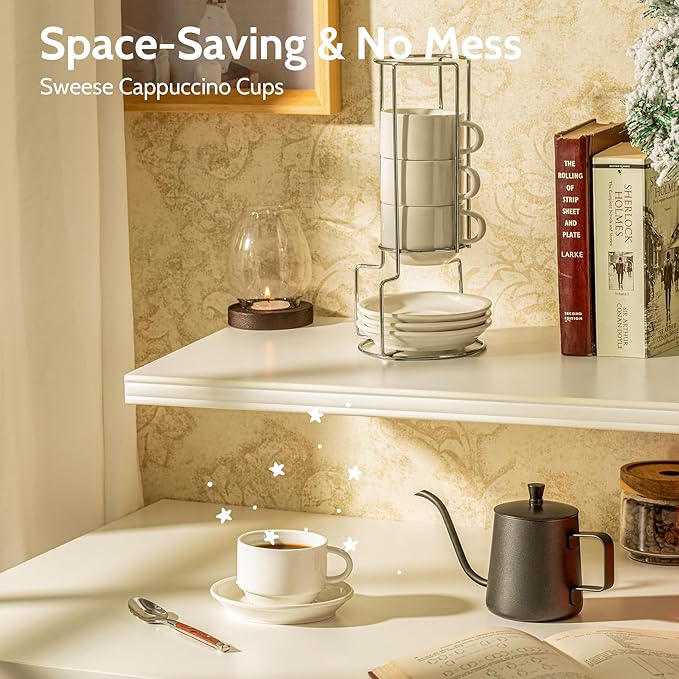 Sweese 8 Ounce Porcelain Stackable Cappuccino Cups with Saucers and Metal Stand - for Specialty Coffee Drinks, Cappuccino, Latte, Americano and Tea - Set of 4, White
