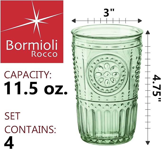 Bormioli Rocco Romantic Set Of 4 Tumbler Glasses, 11.5 Oz. Colored Crystal Glass, Pastel Green, Made In Italy.
