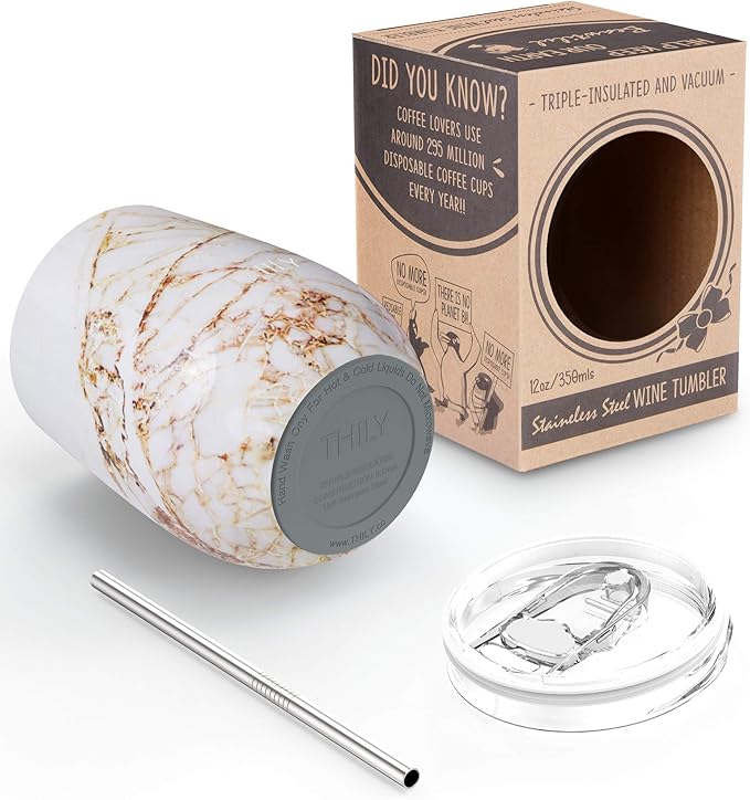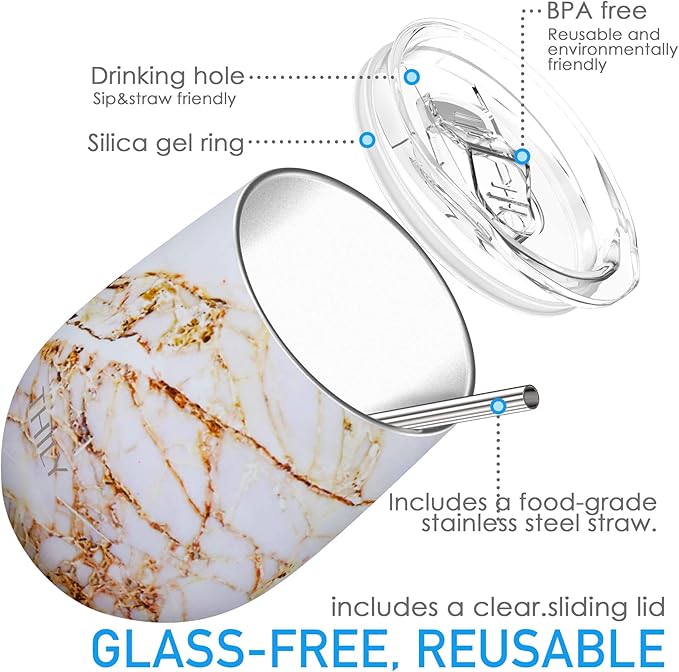 THILY Stainless Steel Stemless Wine Glass Triple Vacuum Insulated Tumbler Travel Cute Cup with Lid, Reusable Straw, Keep Cold & Hot for Wine, Coffee, Xmas Gift, Gold Marble