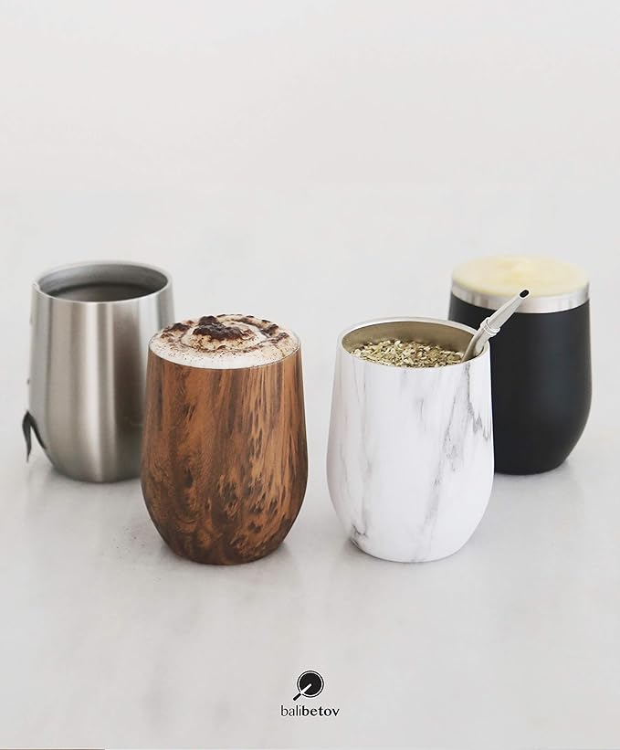 BALIBETOV 5 pcs large Yerba Mate Cup and Bombilla Kit, Includes one 12 oz Yerba Mate Gourd with Lid, Two Bombillas Mate Straw and one cleaning brush | Stainless steel | Double Walled