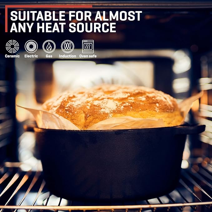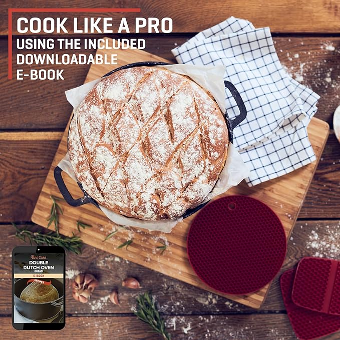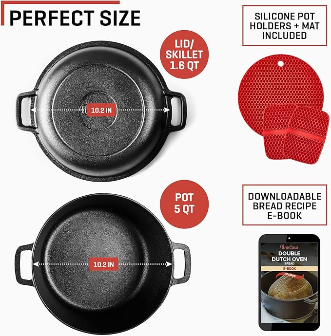 Uno Casa 2-in-1 Cast Iron Dutch Oven Large - 5 Quart Dutch Oven Pot with Lid, Pre-Seasoned Cooking Dish for Bread Baking and Stews - Heavy Duty Cast Iron Pot with Detachable Frying Pan Lid for Versatile Cooking