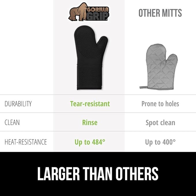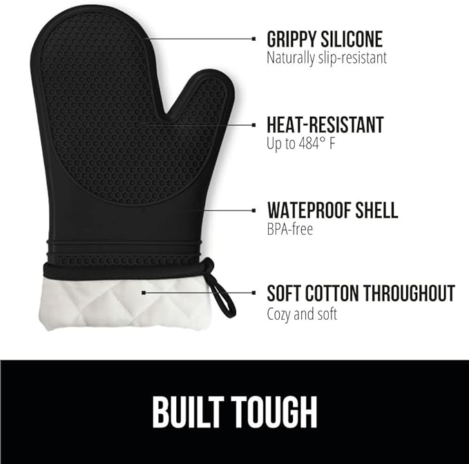 GORILLA GRIP BPA-Free Soft Silicone Oven Mitts, Heat Resistant and Waterproof Cooking Gloves, Thick Cotton Lining, Flexible Gripping, Kitchen Potholders Set, Holiday Baking Essentials, 12.5x8.3, Black