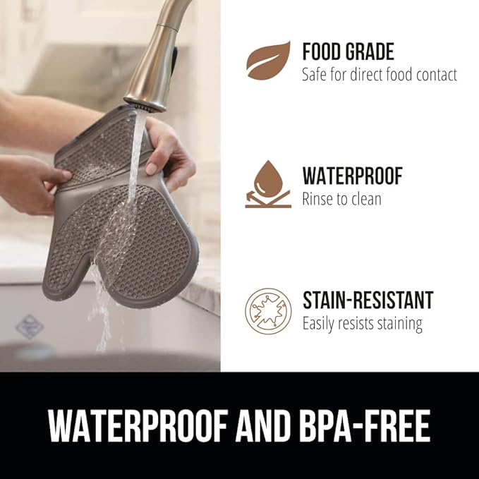 GORILLA GRIP BPA-Free Soft Silicone Oven Mitts, Heat Resistant and Waterproof Cooking Gloves, Thick Cotton Lining, Flexible Gripping for Baking Grilling, Kitchen Potholders Set of 2, 12.5x8.3, Gray