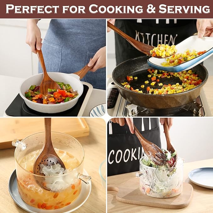 Wooden Spoons for Cooking, 6 Pcs Wooden Utensils for Cooking, Natural Teak Wood Non-Stick Cooking Spoons, Wood Utensils Set for Kitchen