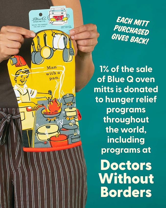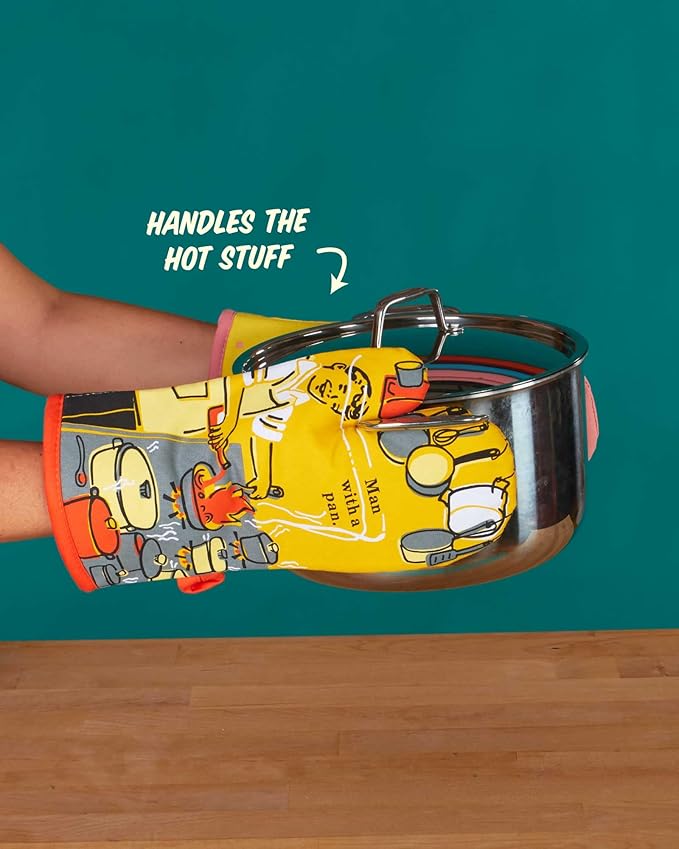 Blue Q Man With a Pan Funny Oven Mitts - Cute Oven Mitts, Home Kitchen Gifts, Cooking Accessories, Super-Insulated Quilting, Comfy Natural-Fitting Shape, 100% Cotton, Machine Wash, Size 12.5"L x 7.5"W