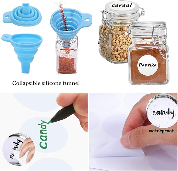 SPANLA Spice Jars, 12 Pack 4oz Small Glass Jars with Airtight Hinged Lid, With 12 Spice Labels & Silicone Funnels, Airtight Glass Jars for Spices, Art Craft Storage (12 Pack)
