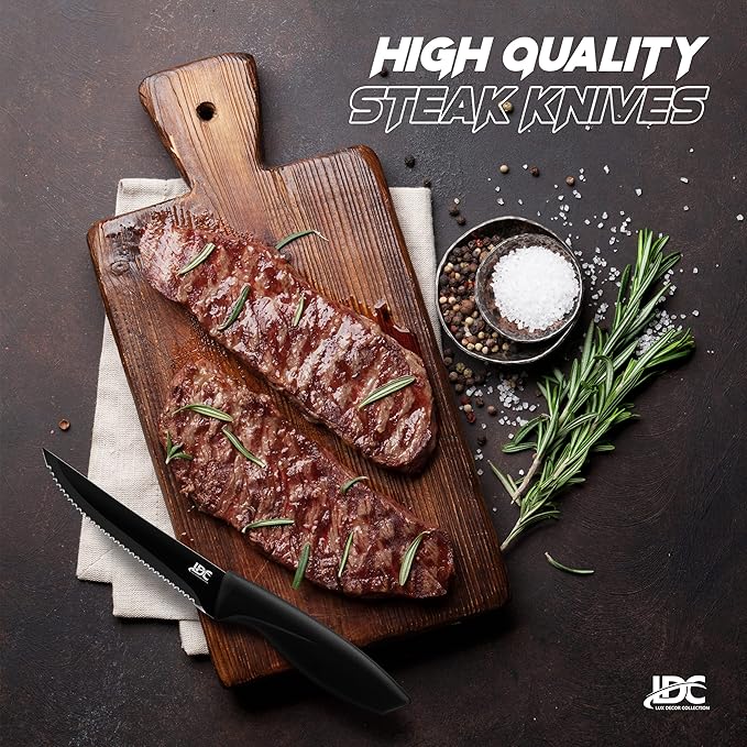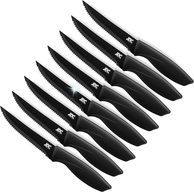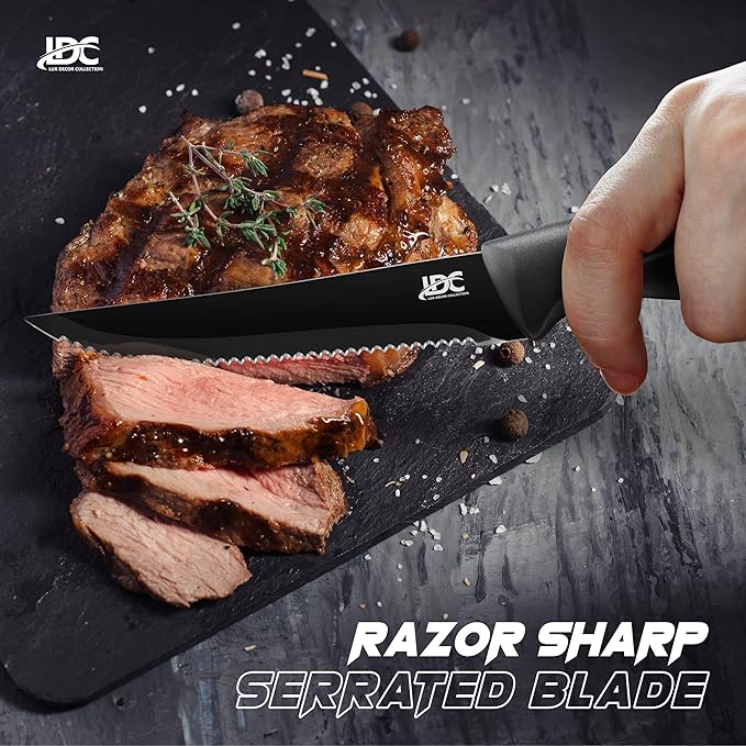 LDC Serrated Steak Knives Set of 8, Elegant Black Ultra Sharp Knives, Dishwasher Safe Stainless Steel Dining Knife Set
