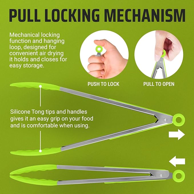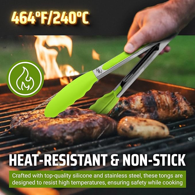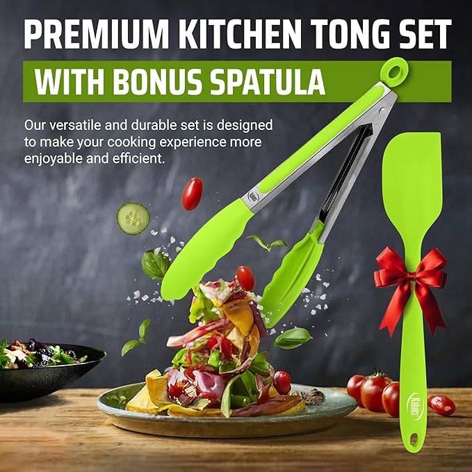 Kaluns Kitchen Tongs for Cooking Grilling Set of 4, BBQ Grill Tongs With Silicone Tip Stainless Steel Heat Resistant, Non-stick Pull Lock, Incl 7, 9, 12 Inch Tong Plus a Silicone Spatula