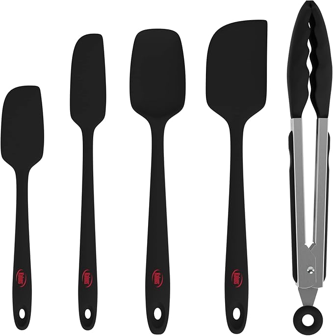 • Kaluns offers a set of 5 Versatile Tools: 1 Spoon Spatula, 1 Large Spatula, 1 Jar Spatula,1 Small Spatula and 9" Tong. They are build with egronomic strong Stainless steel core which holds the spatula sturdy when in use. Our Silicone seamless Spatulas won't rip, break, melt, warp or chip. It is Non-stick and 600 F Heat resistant.